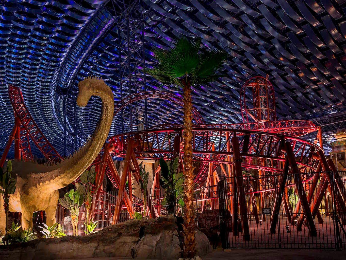 Любители динозавров смогут перенестись в прошлое, исследовать реалистичные экспонаты и прокатиться на тематических аттракционах в зоне Lost Valley. В «Город приведений», который открыт только для гостей старше 15 лет, стоит отправиться любителям пощекотать нервы. Маленькие посетители придут в восторг от огромной надувной площадки в детской зоне. А тем, кто желает приобрести сувениры и пообедать, – добро пожаловать в IMG Boulevard!