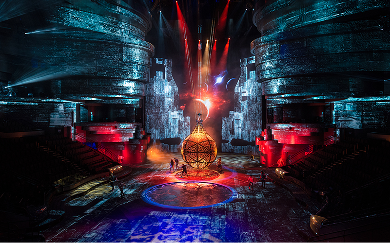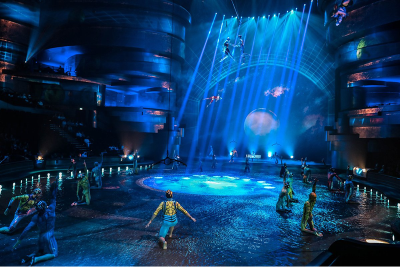 Постановка сочетает в себе элементы цирка, театра и аквашоу одновременно. В нём участвуют 65 артистов из разных стран мира, которые в ходе представления меняют 450 костюмов.