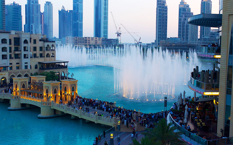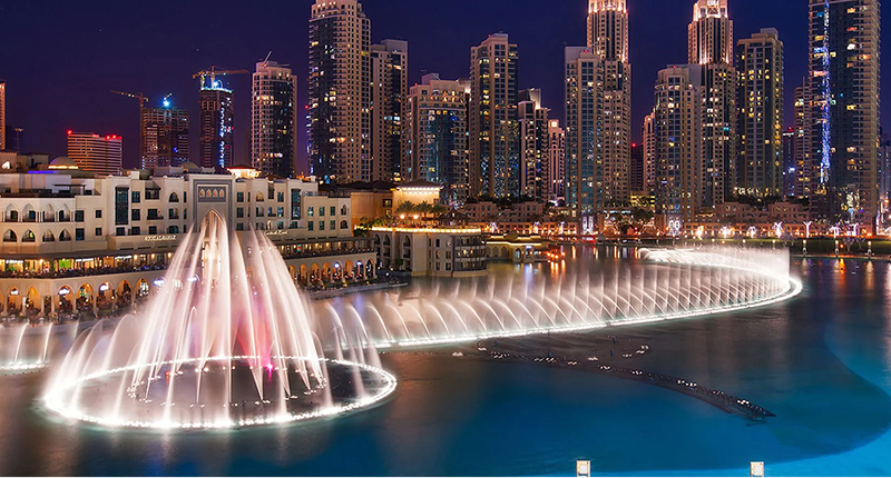 The Dubai Fountain – это одновременно самый высокий в мире фонтан и уникальное шоу, в котором вода, взмывая высоко в воздух и переливаясь всеми возможными цветами, танцует под звуки музыки.